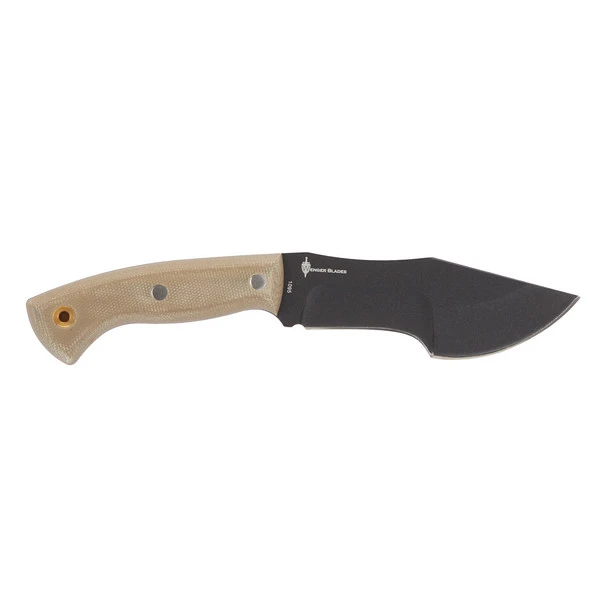 Das Mini Tracker besitzt eine kräftige Klinge mit 5 mm Dicke. Der vordere Teil ist ballig geschliffen und eignet sich damit gut für leichte Hackarbeiten. Die dünnere Klinge in Griffnähe besitzt einen Hohlschliff. Mit ihr erledigst du feinere Schneid- und Schnitzarbeiten, die durch die guten Zugfähigkeiten leicht von der Hand gehen. Als Klingenmaterial wird ein nicht rostfreier Kohlenstoffstahl (1095) verwendet. Zum Schutz vor Korrosion ist der Stahl mit einer abriebfesten Pulverbeschichtung versehen. Er ist sehr schnitthaltig, lässt sich bei Bedarf allerdings auch gut nachschärfen. Ein echter Pluspunkt bei einem Gebrauchsmesser! Der Messerrücken ist so gearbeitet, dass du bei Bedarf mit deinem Feuerstahl leicht Funken schlagen kannst.