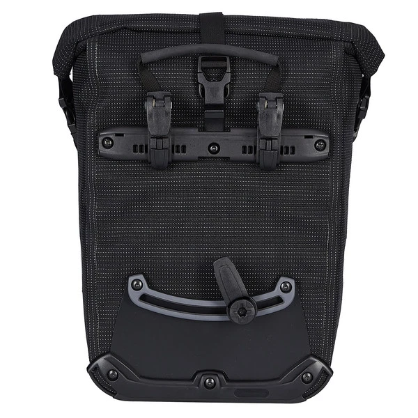 Ortliebs Quick-Lock 2.1 System ist eine Aufhängung für Gepäckträger mit einem Rohrdurchmesser von 8 bis 16 mm. Die beiden oberen Haken lassen sich werkzeugfrei auf der aus einem Stück gefertigten Schiene verschieben und durch Anheben des Tragegriffs öffnen. Der untere Arretierungshaken ist ebenfalls auf einer gekrümmten Schiene individuell anpassbar und werkzeugfrei in 15-Grad-Schritten drehbar. Ein Scheuerschutz im unteren Bereich der Tasche und an der Auflagefläche des Gepäckträgers beugt Abrieb vor.