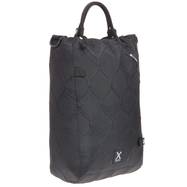 In der Textilie des Beutels ist rundum Pacsafe Exomesh verarbeitet. Das 360-Grad-Exomesh-Gewebe aus Stahlseilen macht den Beutel aufschlitzsicher. Leer ist der Travelsafe X15 auf etwa ein Drittel seiner Größe zusammenfaltbar.