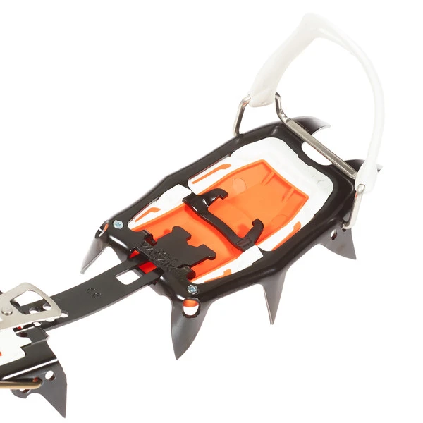 Die zwölf Zacken sind so ausgerichtet, dass sie in jedem Gelände Halt finden: zwei verstärkte, flach ausgerichtete Frontzacken sind bissig im Eis und tragen im Schnee. Vier querstehende Zacken geben Stabilität bei Abstiegen, während die Längsanordnung der Zähne insgesamt für einen guten Halt beim Queren von Hängen sorgt.
