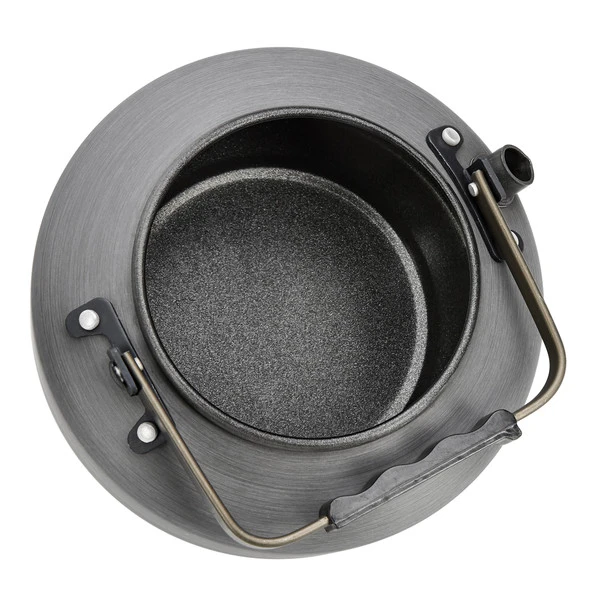 Der leichte Kessel besteht aus hart eloxiertem Aluminium und besitzt ein Fassungsvermögen von 0,9 Litern. Ein kunststoffumwickelter Griff verhindert Verbrennungen beim Hantieren.