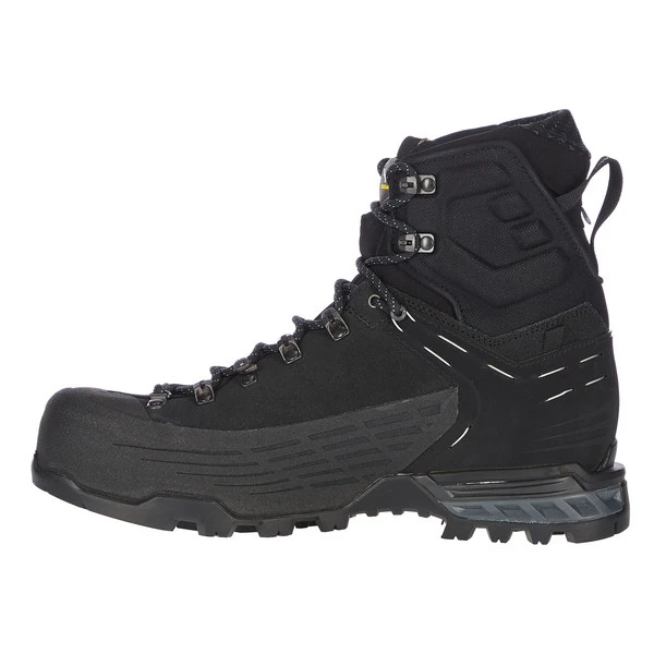 Auffallend ist auch das aggressive Profil der Vibram Sohle. Dadurch bietet sie dir auch auf losen Untergründen und in sehr steilem Gelände überragenden Griff! Im Zehenbereich verfügt die Sohle über eine glatte Kante, in Kombination mit der hohen Torsionssteife des Stiefels kannst du so auch auf kleinen Tritten Halt finden. Die PU-Zwischensohle sorgt dank ihrer stoßabsorbierenden Eigenschaften für hohen Komfort. Dank der hinteren Steigeisenauflage ist der Stiefel bedingt steigeisenfest.