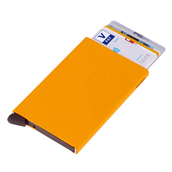 Mit einer einzigen einhändigen Bewegung des Hebels schiebst du deine Karten aufgefächert aus der Hülle hinaus. Je nachdem ob die Karten eine Prägung haben, passen 4 oder 6 Stück hinein. Der Cardprotector ist RFID-safe.